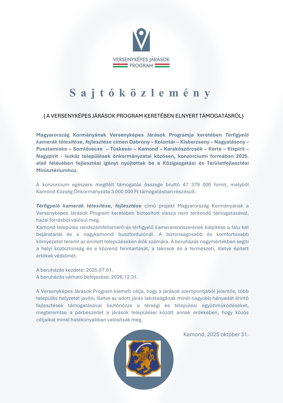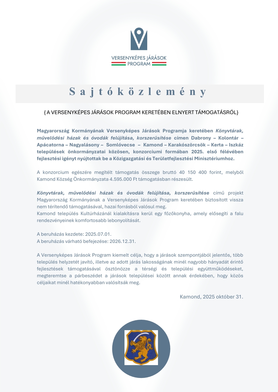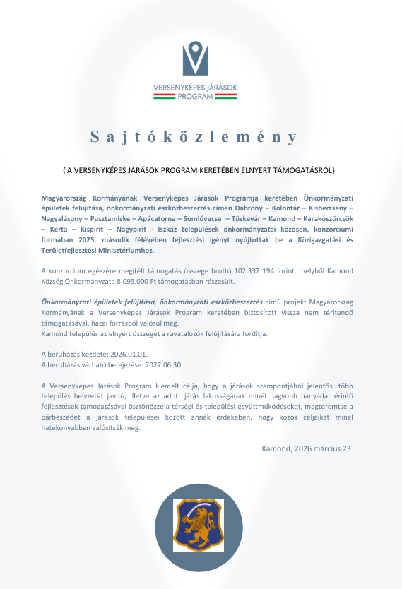 A nyilvános pályázati eljárás során ajánlatot tehet írásban a Kamond, Kossuth u. 28. szám címre postázva a borítékra kérem feltüntetni „Nyilvános pályázat”, valamint elektronikusan a polgarmester@kamond.hu címre. Az ajánlattétel határideje: 2023. december 16. 16 óra.